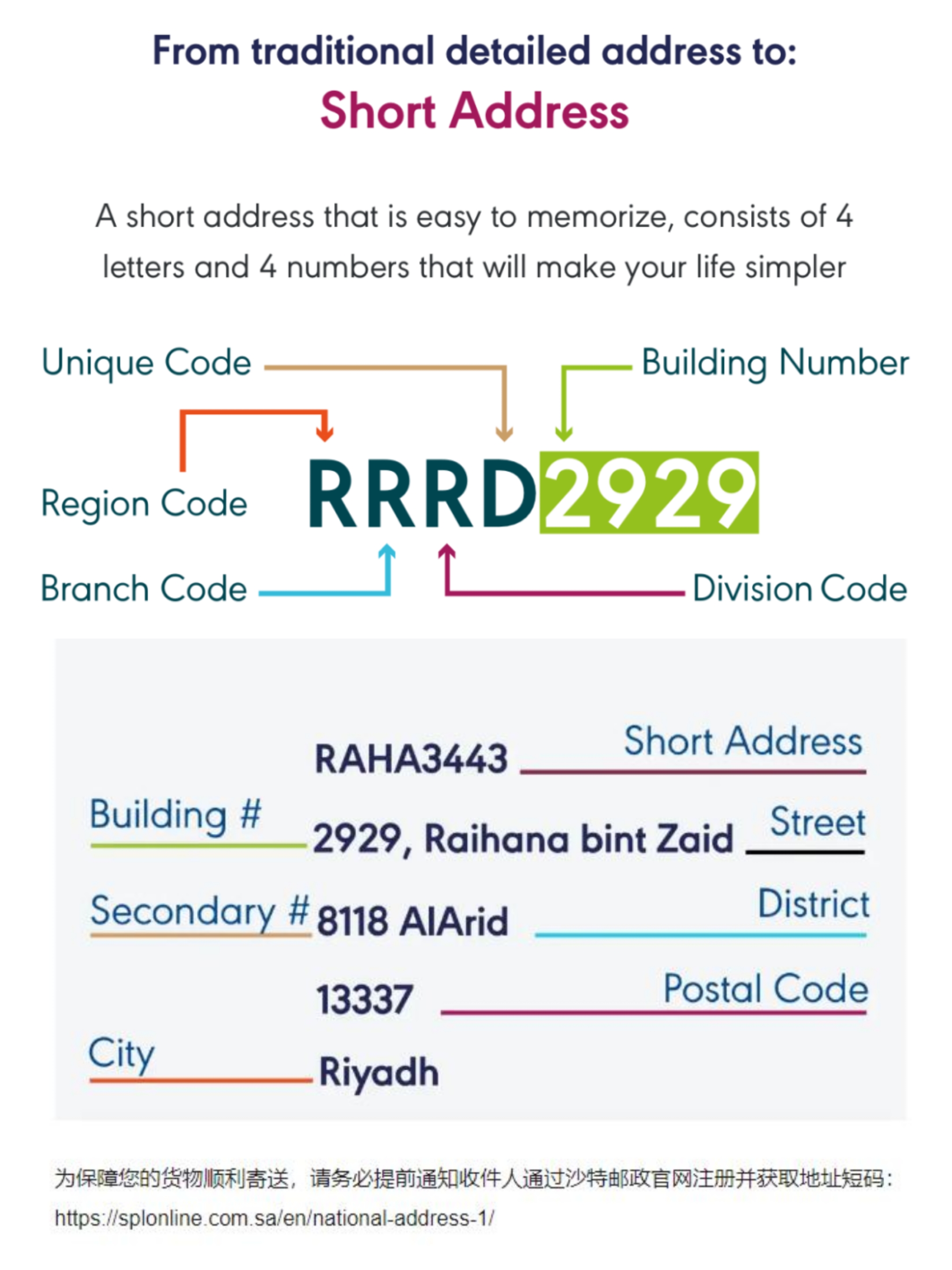 All goods shipping to Saudi Arabia must have the recipient's Saudi short address clearly marked on the shipping label and related documents. Meanwhile it request to provide the Post Code corresponding to the Saudi address.